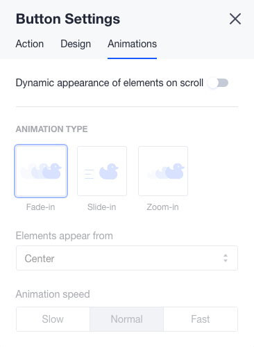 To access button's settings, you need to click on the button and then on the wheel icon. The third tab is 'Animations', here you can choose animation type and speed with which it will appear on the page.