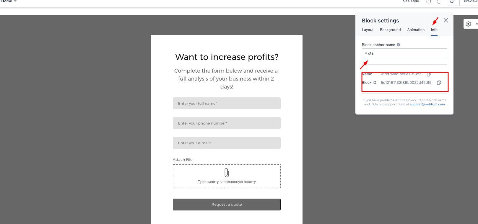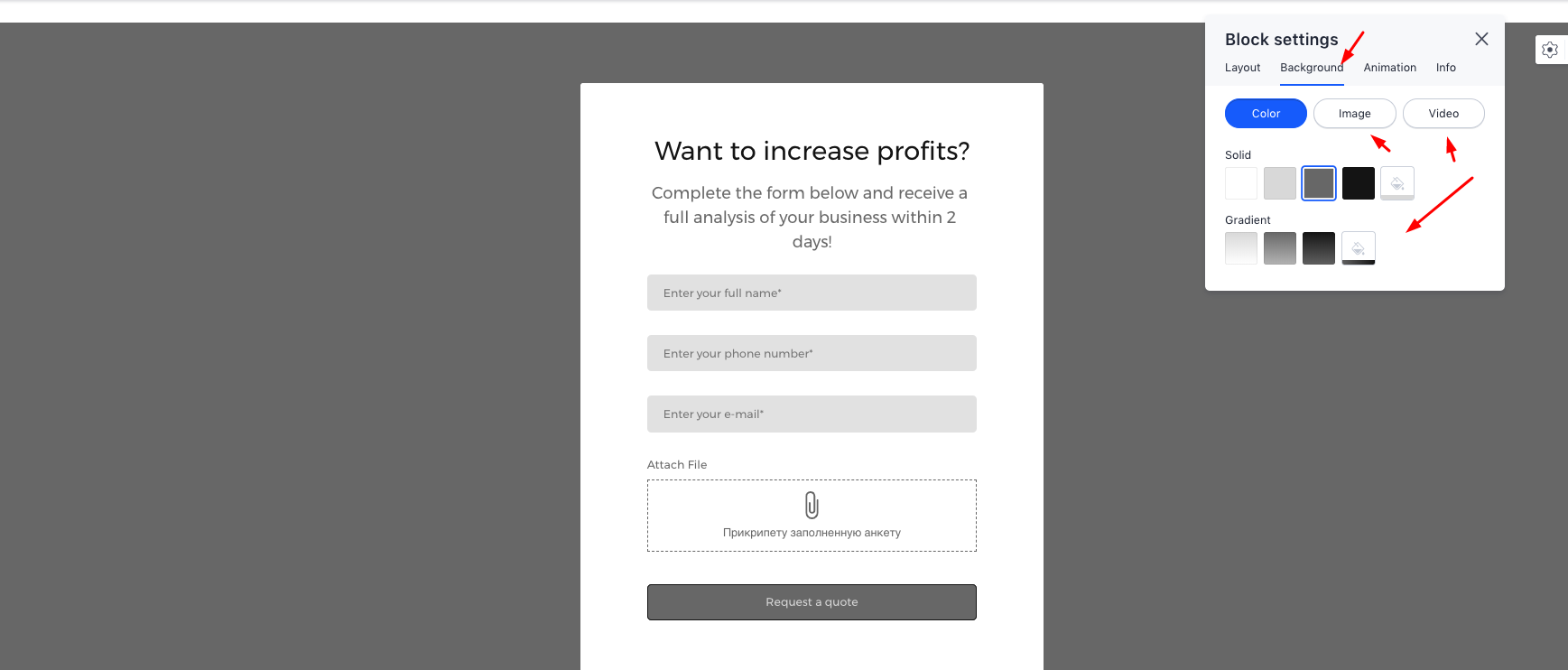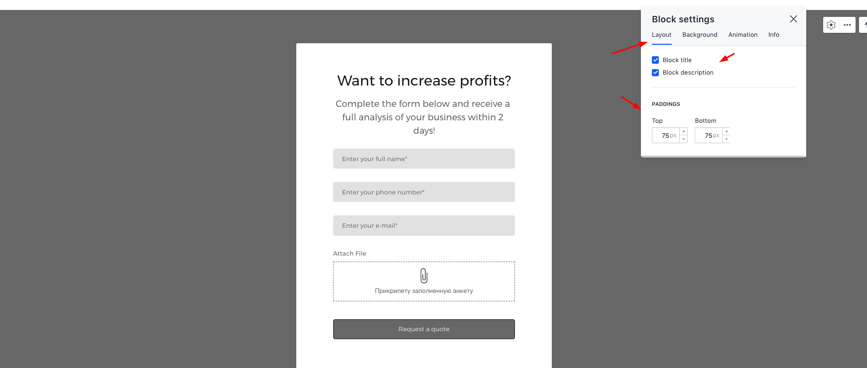 После того как Вы добавили блок на страницу, там есть ряд настроек, которые Вы можете использовать чтобы кастомизировать Ваш сайт.