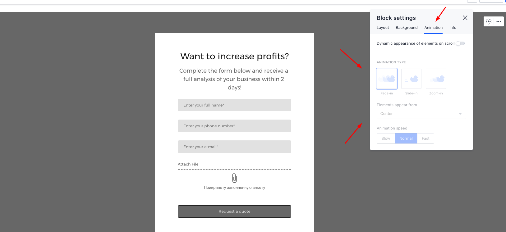3.Вкладка Animation - позволяет добавить анимацию для блока.