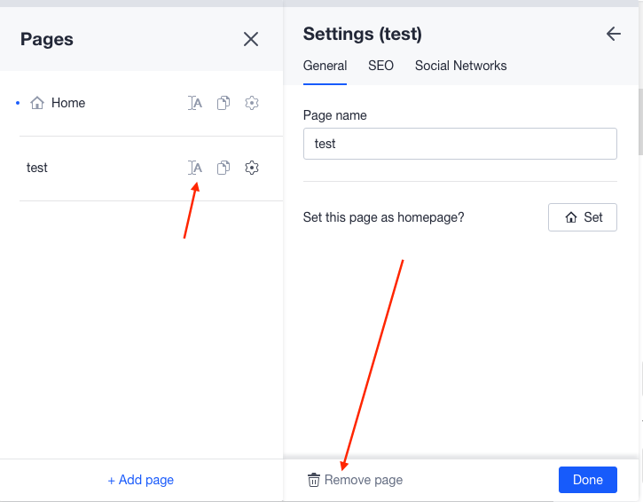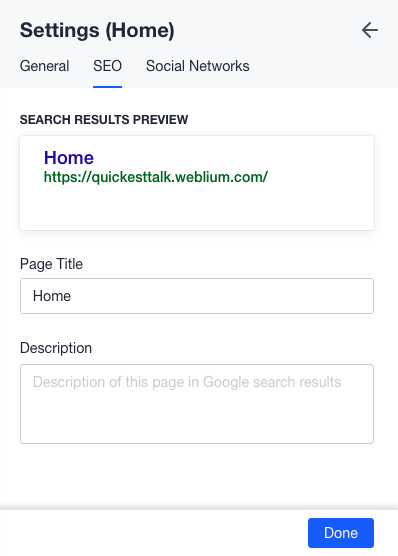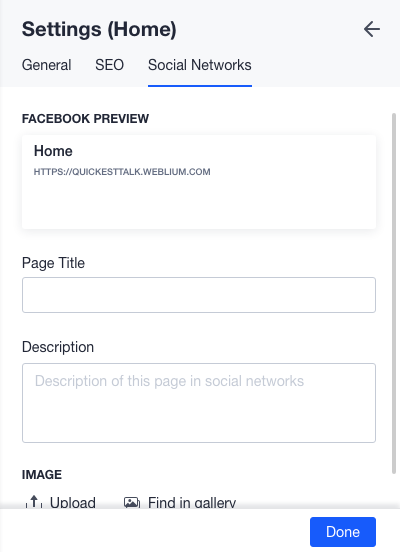 Возле имени страницы есть 3 кнопки, когда мы нажимаем на первую в форме колеса - мы видим 3 вкладки. General - здесь вы можете назвать вашу страницу, спрятать её с меню или сделать главной. Во вкладке SEO, вы можете редактировать то как эта страница будет отображаться в Google и описание. В Social Networks вкладке, вы можете редактировать как ваша ссылка на страницу будет выглядеть в фейсбуке, можете назвать и загрузить картинку.