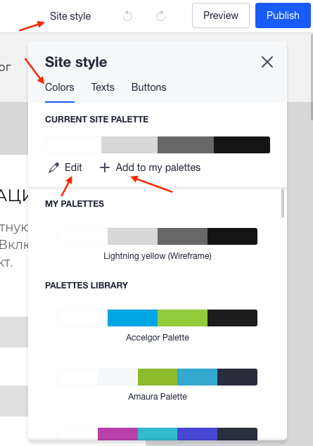 После клика на кнопку Site style, которая находится в правом верхнем углу, вы увидите вкладку с цветами и здесь у вас есть возможность управлять цветовой гаммой вашего сайта выбирая с нашей библиотеки палитр или нажать на Edit и создать свою собственную палитру.