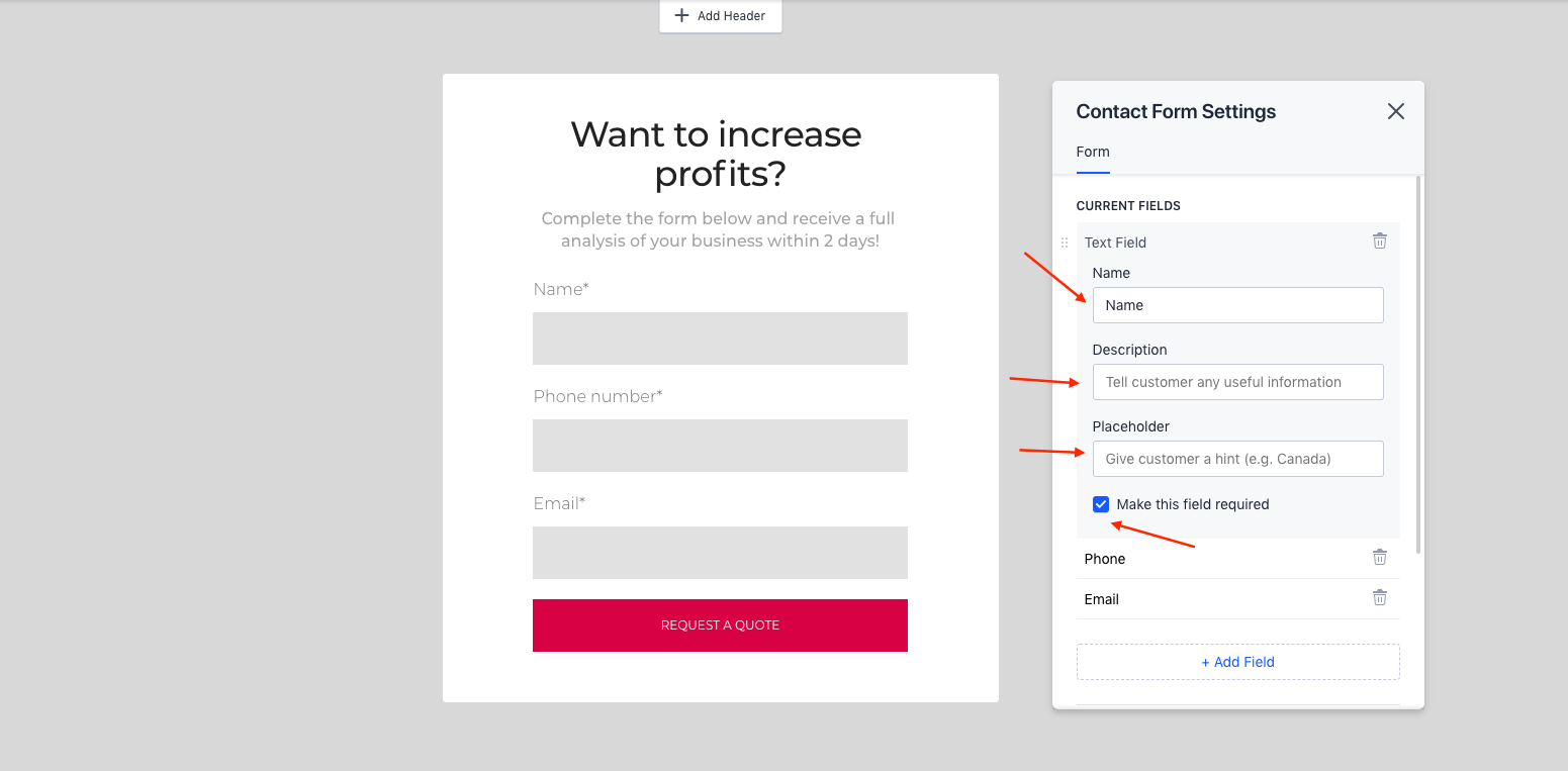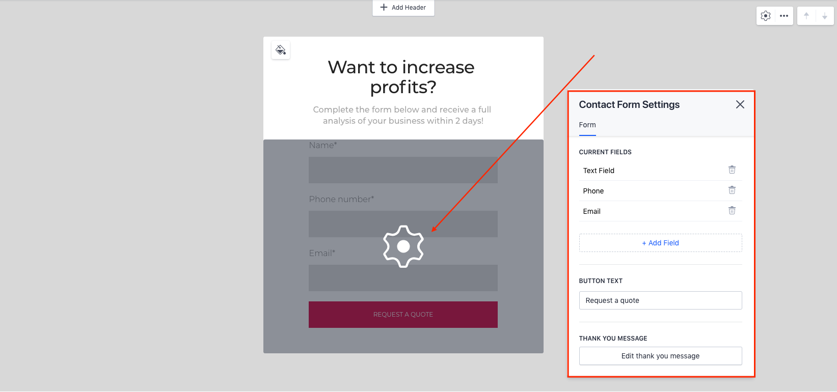 Чтобы попасть в настройки контактной формы, Вам надо навести на поля и нажать на кнопку в виде колесика, которая появится при наведении.